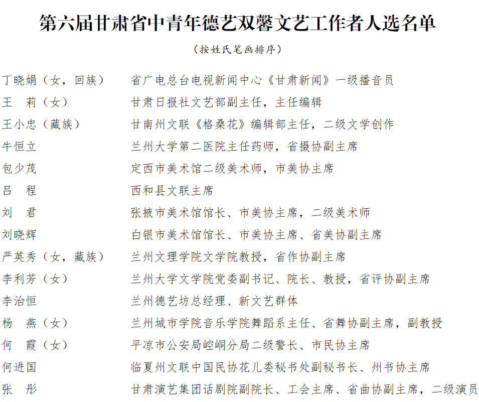 附 件:第六届甘肃省中青年德艺双馨文艺工作者人选名单
