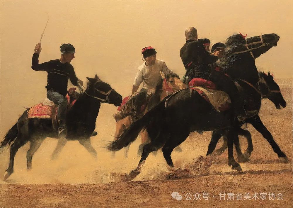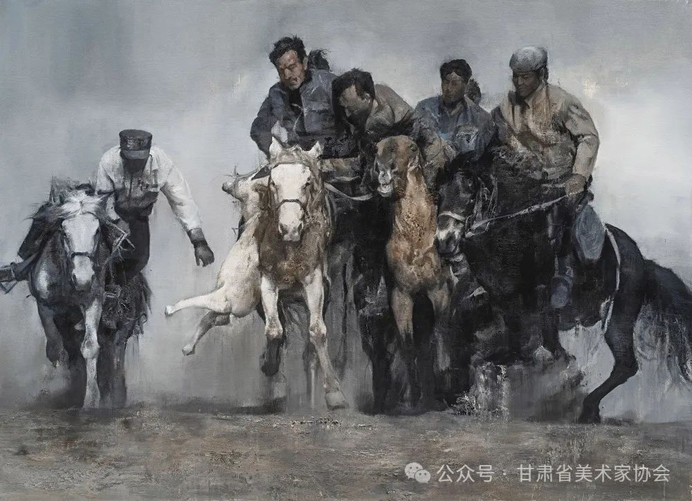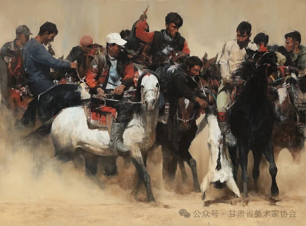 一、塔吉克叼羊是一种极具特色的传统竞技项目,它不仅展现了塔吉克族牧民的力量和勇气,还体现了他们对生活的热爱和对传统文化的坚守。作为一项非物质文化遗产,叼羊这一古老而充满激情的运动,深深植根于塔吉克民族的文化传统之中。作为一名画家,我被这项运动所蕴含的力量、勇气和团队精神所吸引,从而萌生了创作塔吉克叼羊系列作品的理念。