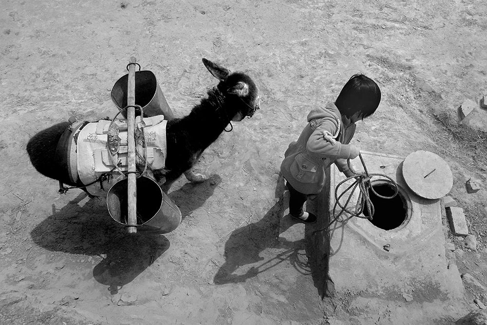 2011年04月03日,甘肃省东乡县高山乡布楞沟村,一个女孩在水窖前打水,她每天放学回家的第一件事,就是牵着毛驴到山下去驮水。