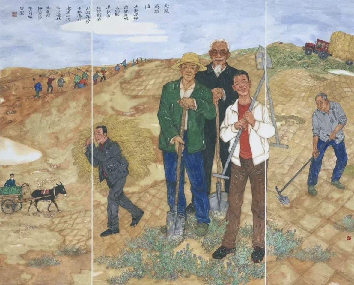 《大漠英雄曲——致敬八步沙六老汉三代人治沙造林先进群体》纸本设色 192×154cm 2020